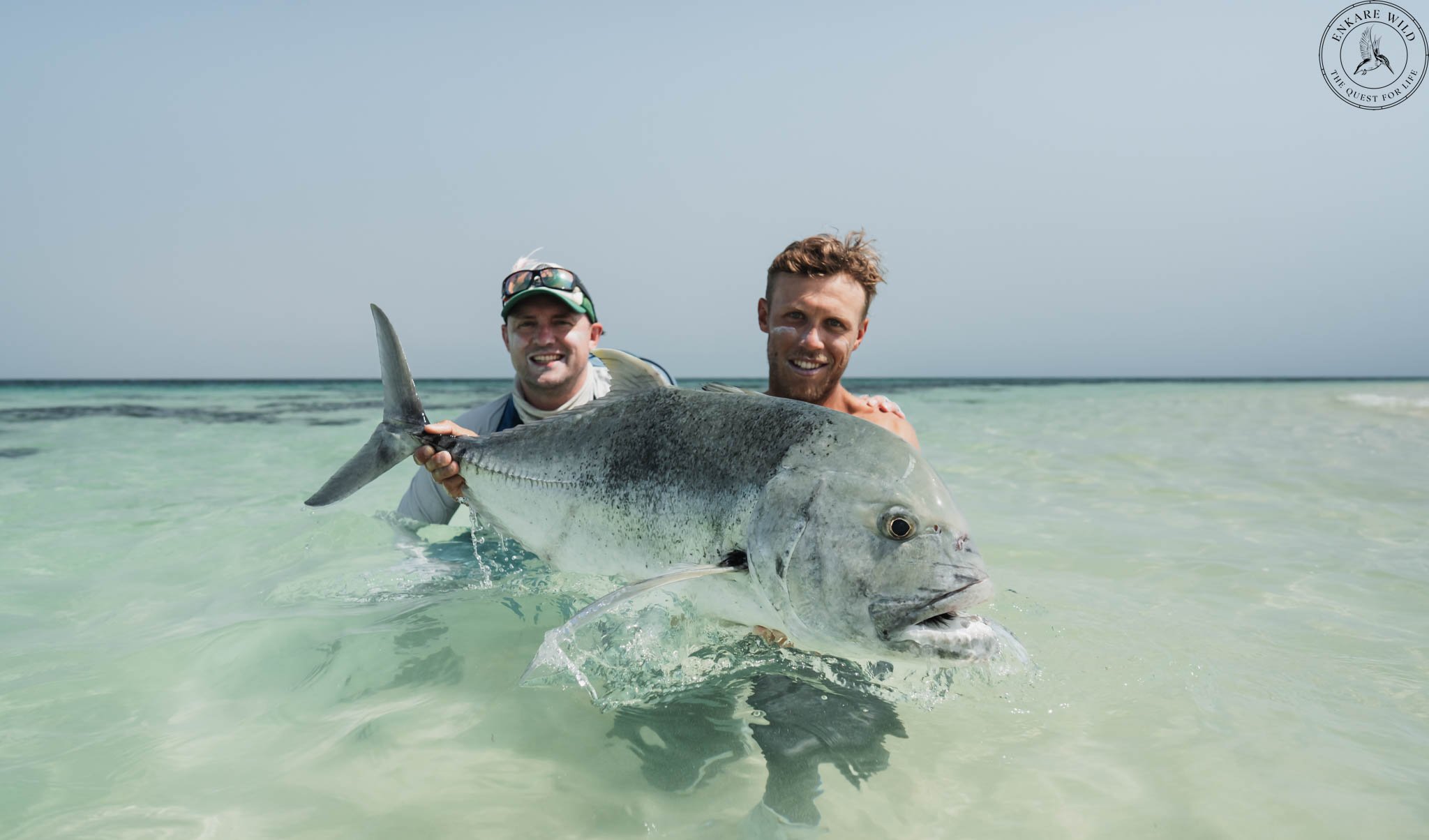 We ran north to a cluster of islands that had been productive in recent days. Ben and Henry were with me. Almost immediately we found two GTs pushing across a pale flat. Ben sent out a solid cast, the fish lit up, and in a flash he was on. The GT tore off, we all stood as spectators and eventually, after a proper battle and a broken twelve weight, we tailed a powerful fish. Ninety eight centimetres, just shy of a metre but absolutely worthy of celebration on any fly fishing expedition in Eritrea.