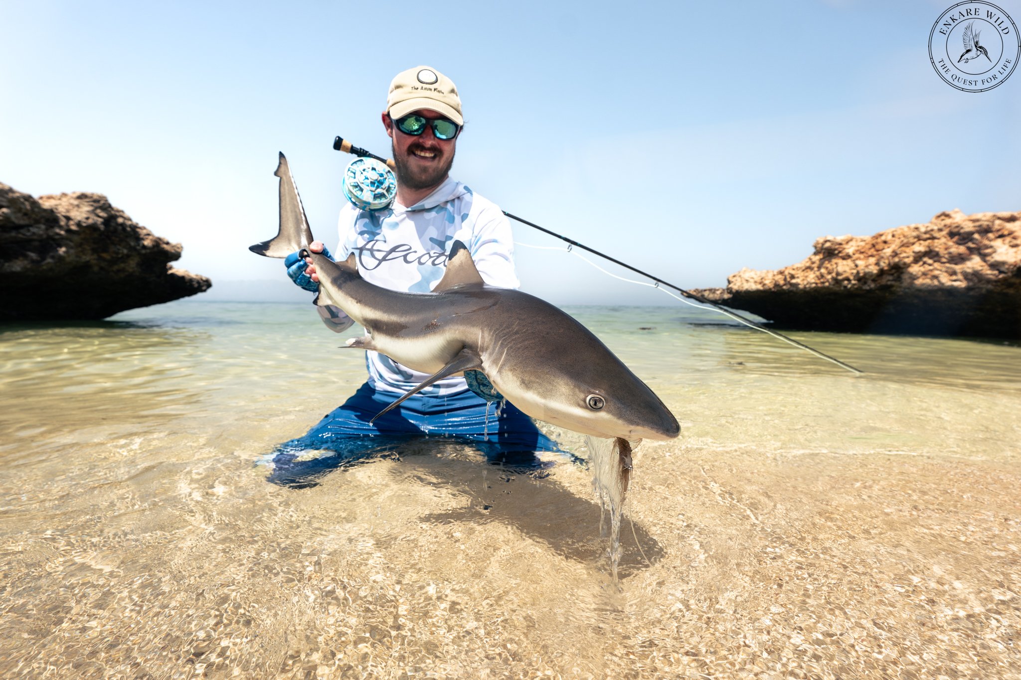 Early on, Fergus landed a fine grouper from the flats, a bright start. Then came a small reef shark cruising the shallows. “Go on then,” I said. The first cast drew a lazy follow; the second an aggressive eat. “Set! Set!” I yelled as the fish tore for the drop-off. I waded in, clearing weed from the line, and after a quick fight we landed it cleanly. Hook set perfectly in the scissors.