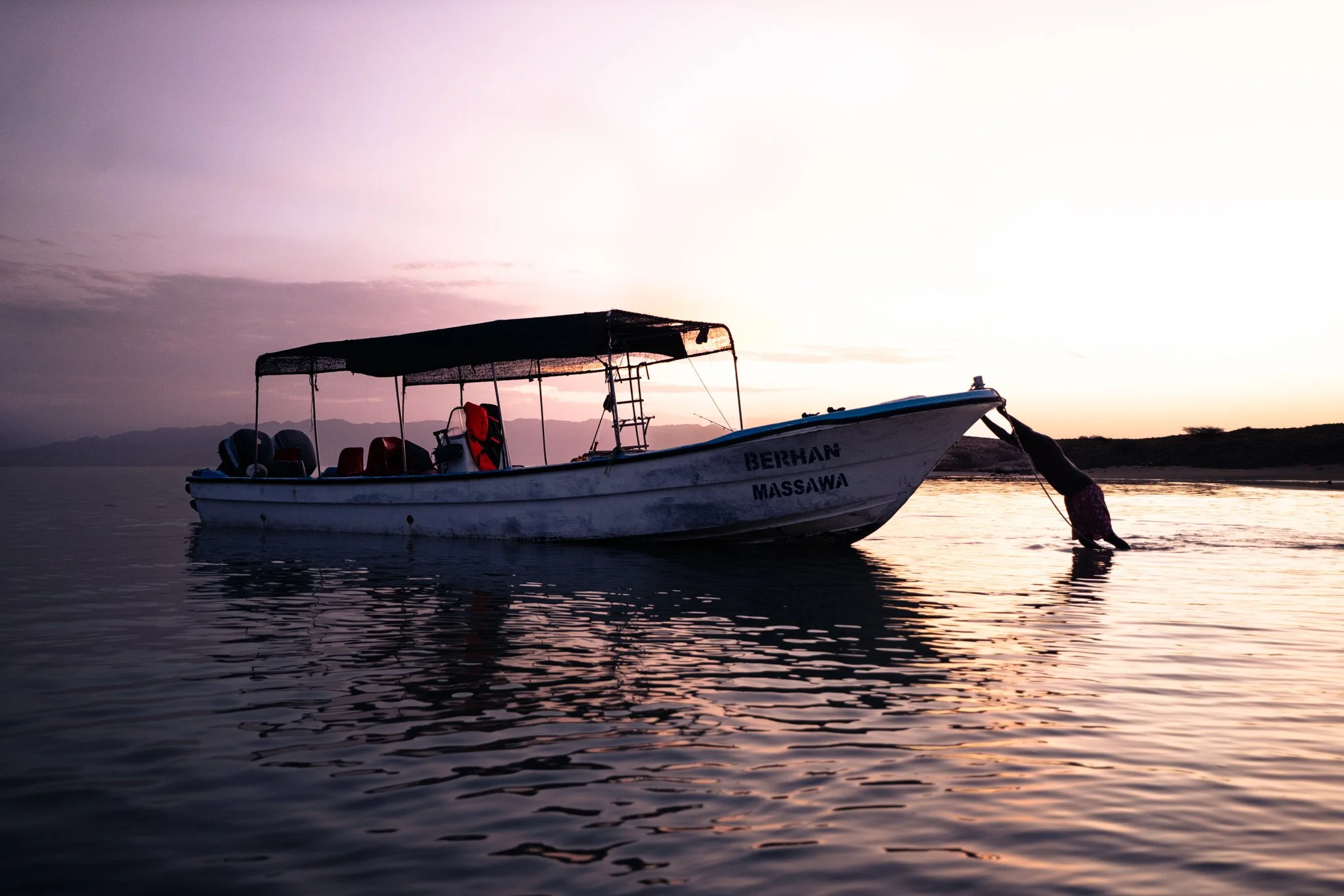 Before heading to sea, we stocked up in town: water, food, fuel for the days ahead. By nightfall we descended from 8,000 feet toward the coast, Nick, aka 250ml, making us stop no fewer than twenty times to “water the flowers.” By the time we hit sea level we were a crate deep into the beers. Dinner, then beds in the Dhalak Hotel. Tomorrow, it began.